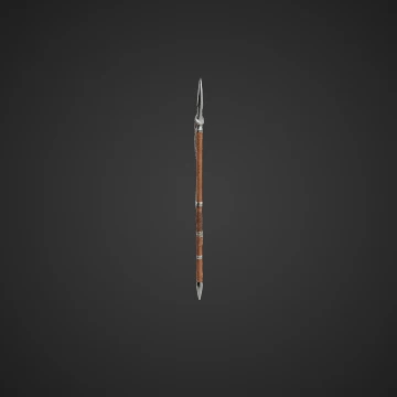 A meticulously crafted Viking war spear featuring a long wooden shaft with intricate carvings and a sharpened metal tip. The shaft is approximately 7 feet long, tapering towards the tip, and has a rustic brown finish with visible grain patterns. The spearhead is made of polished steel, exhibiting a slight sheen and realistic wear marks. This model is perfect for historical reenactments and video games set in the Viking era.